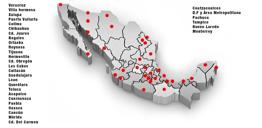 Para garantizar la calidad de los servicios que prestamos SERMIN DE OCCIDENTE considera como factor y clave de éxito la proximidad al cliente. Contamos con cobertura en toda la Republica Mexicana, y puntos estratégicos en: